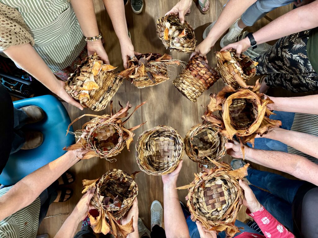Create a freestanding sculptural vessel with Bangalow Palm leaf sheath. You will learn how to prepare the material, cut, hand-stitch and adorn with found natural treasures into a beautiful form to showcase in your home or to give as a gift to that special someone.